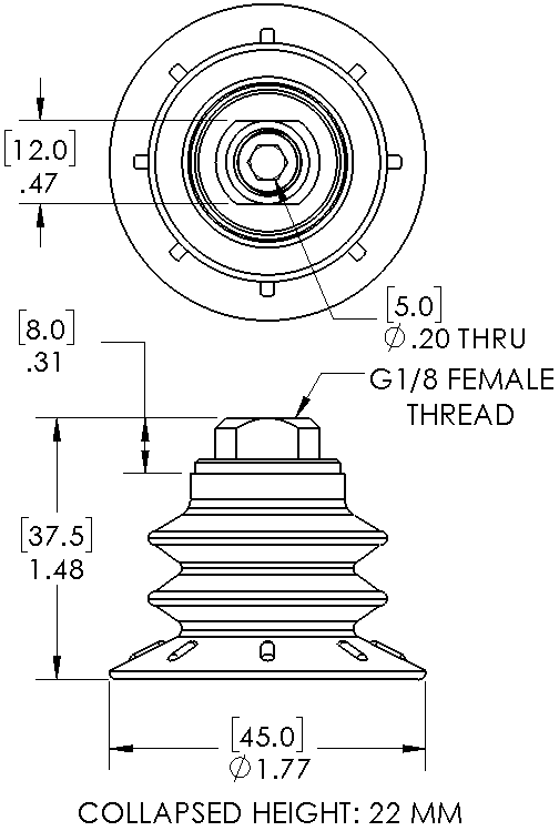 Style: Bellows Cleats: No Material: Polyurethane Thread Size: 1/8" female Bellows: 2.5 Outside Diameter: 45.0mm Weight(lbs): .033 Color: Yellow Lifting Capacity: See Chart [X] CloseLifting Capacity for Item MB45P-3055-G18F
