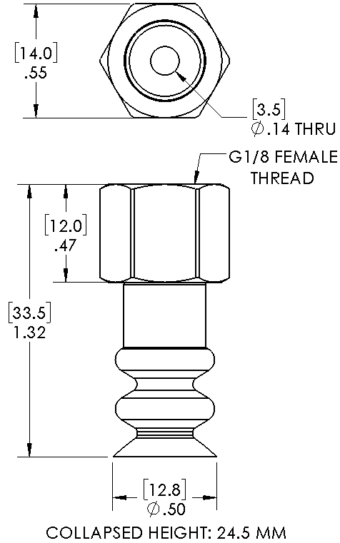 Style: Bellows Cleats: No Material: NBR Thread Size: 1/8" female Bellows: 2.5 Outside Diameter: 12.0mm Weight(lbs): .0093 Color: Black Lifting Capacity: See Chart [X] CloseLifting Capacity for Item MB12-NBR-G18F