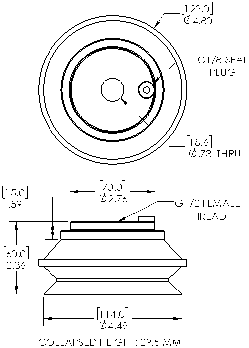 Style: Bellows Cleats: No Material: NBR Thread Size: 1/2" female Bellows: 1.5 Outside Diameter: 110.0mm Weight(lbs): .4750 Color: Black Lifting Capacity: See Chart [X] CloseLifting Capacity for Item PSB110-NBR-G12F