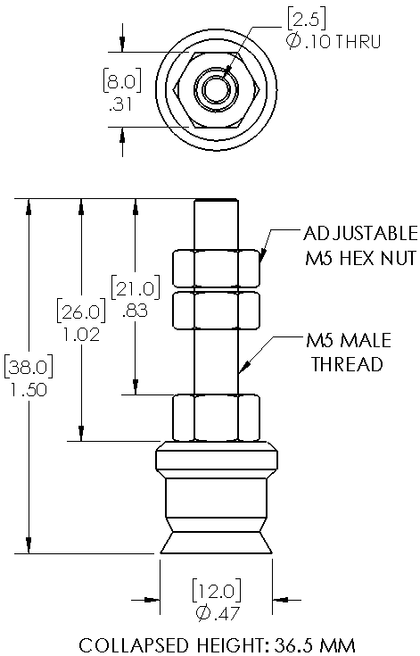 Style: Flat Cleats: Yes Material: Silicone Thread Size: M5 male Outside Diameter: 12.0mm Weight(lbs): .0220 Color: Translucent Lifting Capacity: See Chart [X] CloseLifting Capacity for Item V-ZPT10CS-M5