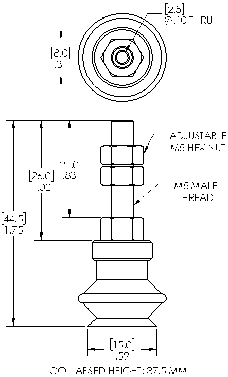 Style: Bellows Cleats: No Material: Silicone Thread Size: M5 male Bellows: 1.5 Outside Diameter: 15.0mm Weight(lbs): .0230 Color: Translucent Lifting Capacity: See Chart [X] CloseLifting Capacity for Item V-ZPT13BS-M5