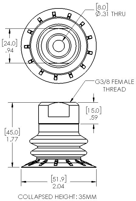 50mm 2.5 bellows dual durometer Polyurethane suction cup, thin lip, and G3/8 female fitting with screen
