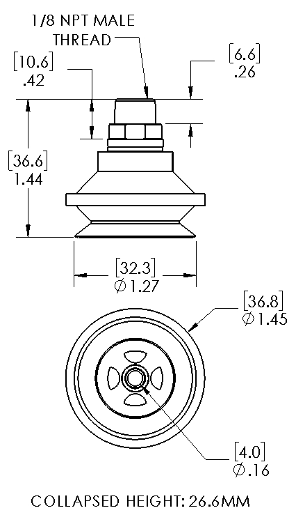 Style: Bellows Cleats: No Material: Silicone Thread Size: 1/8" male Bellows: 1.5 Outside Diameter: 30.0mm Weight(lbs): .0195 Color: Translucent Lifting Capacity: See Chart [X] CloseLifting Capacity for Item PSB30-SIT-18MS