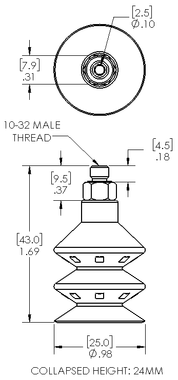 Style: Bellows Cleats: No Material: Silicone Thread Size: 10-32 male Bellows: 2.5 Outside Diameter: 25.0mm Weight(lbs): .0158 Color: Translucent Lifting Capacity: See Chart [X] CloseLifting Capacity for Item MB25-SIT-1032M