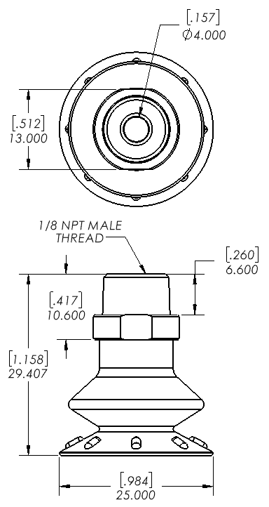 25mm single bellows Polyurethane suction cup (30/55 durometer) with low profile 1/8 Male NPT fitting
