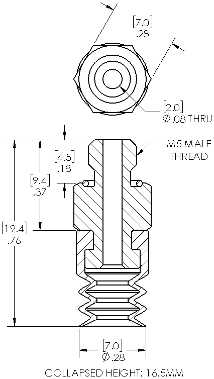 Style: Bellows Cleats: No Material: Silicone Thread Size: M5 male Bellows: 2.5 Outside Diameter: 7.5mm Weight(lbs): 0.0033 Color: Translucent Lifting Capacity: See Chart [X] CloseLifting Capacity for Item MB7-SIT-5M