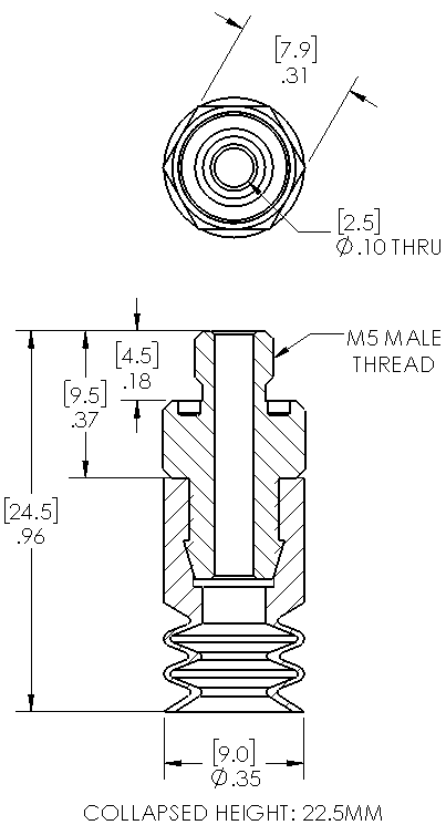 Style: Bellows Cleats: No Material: Silicone Thread Size: M5 male Bellows: 2.5 Outside Diameter: 9.0mm Weight(lbs): 0.0033 Color: Translucent Lifting Capacity: See Chart [X] CloseLifting Capacity for Item MB10-SIT-5M