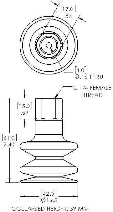 Style: Bellows Cleats: No Material: Silicone Thread Size: 1/4" female Bellows: 2.5 Outside Diameter: 42.0mm Weight(lbs): 0.57 Color: Translucent Lifting Capacity: See Chart [X] CloseLifting Capacity for Item MB42-SIT-G14F
