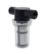 Plastic vacuum filter with long bowl. 1/4 NPT thread, FDA approved black Nylon body, clear Nylon bowl, Buna-N gasket, 40 micron stainless steel mesh filter element.
